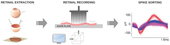 Extracellular recordings were obtained from the ganglion cell layer, by means of an array of 100 electrodes []. Electrical signals captured by the array electrodes were digitalized and stored using a data acquisition and signal processor system. Spike sorting was accomplished by well-known clustering algorithms and Principal Component Analysis (PCA).