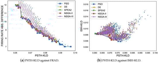 Multi-objective graphs and Pareto-optimal sets of all multi-objective optimisation metaheuristics facing each pair of criteria. (a) The PSTH-KLD metric against the Firing Rate Absolute Difference (FRAD) metric with their Pareto fronts; (b) The PSTH-KLD metric against the ISIH-KLD metric with their Pareto fronts; (c) The PSTH-KLD metric against the RFAD metric with their Pareto fronts; (d) The FRAD metric against the ISIH-KLD metric with their Pareto fronts; (e) The FRAD metric against the RFAD metric with their Pareto fronts; (f) The ISIH-KLD metric against the RFAD metric with their Pareto fronts.