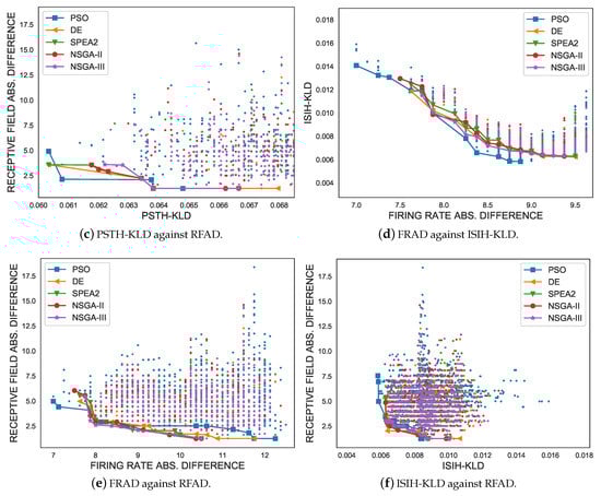 As detailed above, this study addresses a multi-objective optimisation problem in which all objectives should be minimised. Two of the metrics—PSTH-KLD and ISIH-KLD—represent the relative entropy, and are responsible for measuring the similarity between two distributions. Therefore, they should be minimised. Likewise, the FRAD should be minimised, as the firing rate should be as similar as possible. Lastly, models of greater reliability were obtained, by ensuring that the area of the receptive field of the RGCs was of an appropriate and similar size.