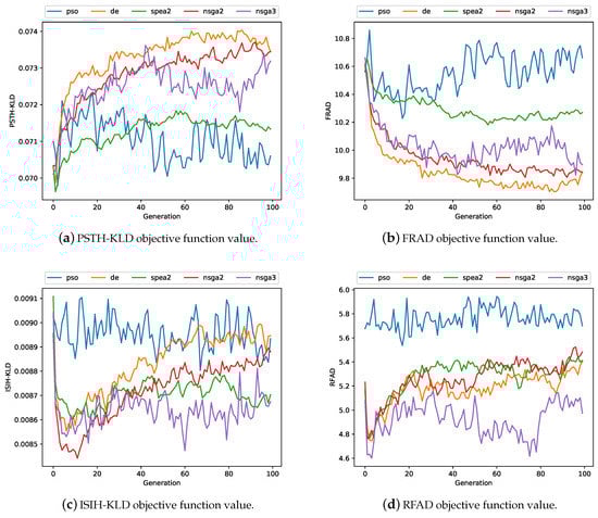 Average value of the objective functions over 100 generations: Particle Swarm Optimisation (PSO) (blue), DE (orange), SPEA2 (green), NSGA-II (red) and NSGA-III (purple).