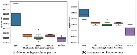 For the purpose of avoiding the stochastic consequences of all multi-objective optimisation metaheuristics, 10 independent executions were performed per metaheuristic. As indicated in Section 3.7, the experiments are computationally expensive (the computation time for each iteration required was ~20 min), so it was estimated that running each experiment 10 times would avoid stochastic effects. As described in Section 3.6, a metric that can be used to evaluate the results was necessary, due to the multi-objective nature of the problem. Figure 7 shows the average values of the four objective functions for all the executions, from which no clear conclusions can be drawn. As for the hypervolume, Figure 8a shows the distribution of the maximum HV metric of the 10 experimental executions, and Figure 8b shows the distribution of their last generation. The data distribution of the HV metrics is represented below in two box plots, enhancing our understanding of the sample data, which will help us draw comparisons between samples. Whenever one approximation dominates another approximation, the HV of the former will be greater than the HV of the latter. It appears that a variant of the NSGA-II algorithm, as the selection algorithm for the maintenance of the population size in the DE experiments, produced very similar results. In contrast, SPEA2 results were very similar to those for DE and NSGA-II HV, although their distributions were wider. The worst results were obtained with the NSGA-III algorithm and the best results, with the PSO algorithm.