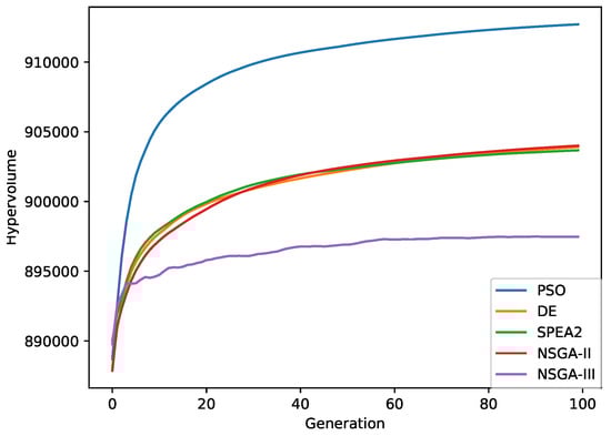 Figure 9 shows the average value of the HV performance metric for all algorithms over 100 generations. Note that the HV metric can be reduced during the experiment (NSGA-III algorithm). This is because neither multi-objective optimisation metaheuristic optimises the HV metric directly, unlike other search heuristics such as Hype []. As stated in Section 3.6, the best results were achieved by the PSO algorithm after the tenth generation, because, in all likelihood, it maximises the number of elements of the Pareto optimal set and the spread of solutions found through the leader selection mechanism. In contrast, note that the worst results were obtained with the NSGA-III algorithm.