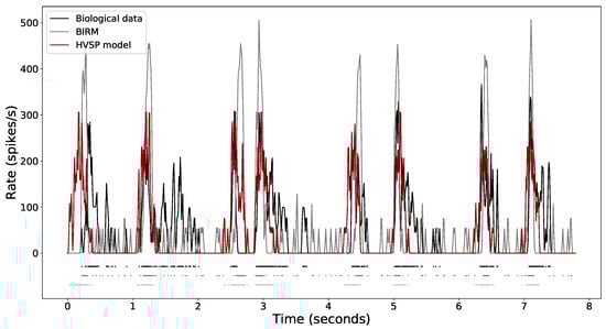 Last, Figure 10 shows the spike rasters of one retinal ganglion cell responding to four repeated trials of the same stimulus (top black row) compared to the predictions of the tuned retinal model under study—BIRM (middle grey row)—and the HVSP model (bottom red row), to show how the models predict retinal responses. A variety of parameters for the HVSP model were explored, based on the recommendations of the original study []. In the same graph, the peristimulus time histograms of the spike rasters are shown, which makes it possible to summarise the time-varying firing rate exhibited by the biological data and both models. PSTHs were computed by binning each response, then summing and filtering with a Gaussian function. Each set of raster data is represented together with the accumulated raster which gathers all repetitions for biological (black) and predicted cases (grey for the tuned BIRM and red for the HVSP model). In the case of the data predicted with the tuned model, the four rasters were generated by one of the individuals from the PSO Pareto front after performing an analysis and selection of the elements of the Pareto front. Rasters of RGC responses and the corresponding simulated responses from both models illustrate that the tuned model captures the structure of the RGC spike trains in a similar way to the HVSP model. The average firing rates of biological data, HVSP model output and tuned BIRM output were compared for calculation of the Pearson correlation coefficient (PCC) as a performance measure, with the purpose of quantifying the similarity between predicted and recorded firing rate traces. Both models can predicate the RGC response with PCC up to 0.45, consistent with previous results []. In addition, as can be seen in the figure, the adjusted BIRM is able to capture the regions with low firing rates with greater precision than the HVSP model (flat regions).