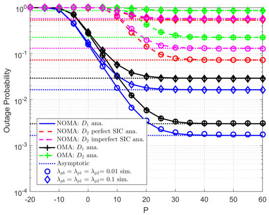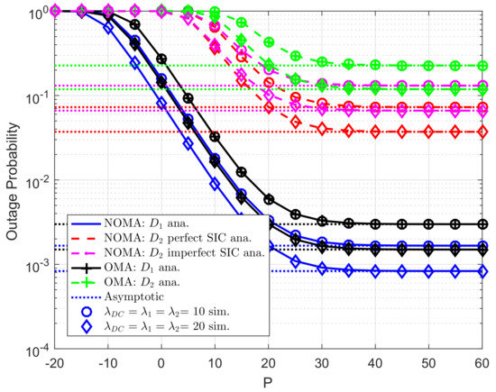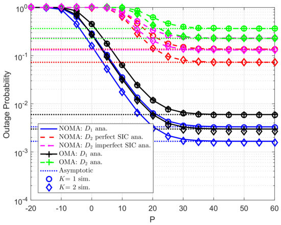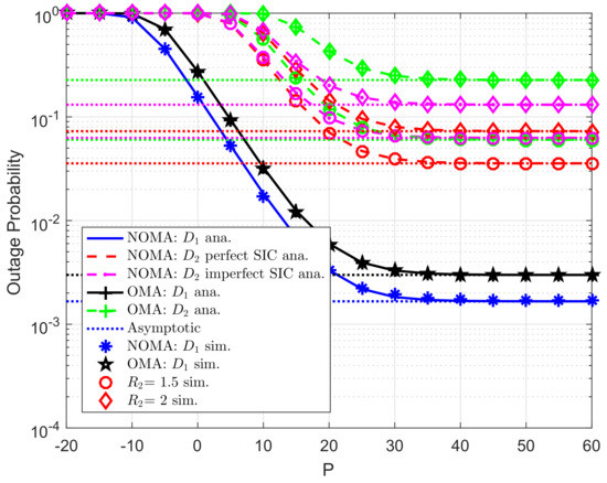 Figure 2 illustrates the outage probability varies under increasing transmit power P from −20 (dB) to 60 (dB). More specifically, two scenarios are studied for user , i.e., imperfect SIC and perfect SIC at the receivers of user . For these scenarios, we set channel gains of related links as , . For power allocation factors assigned to each NOMA user, we set . It can be seen clearly that tight matching simulation and analysis results means the correctness of the analytical outage probability which is verified by simulation results. The asymptotic curves match with exact curves at very high value of P. As a result, the correctness of the asymptotic expressions corresponding the considered schemes is also verified. It is shown that user achieves the smallest outage probabilities with in the whole SNR regime. The main reason makes worse outage behavior at user is resulted by lower power allocation factor assigned to user . It is confirmed fairness among two NOMA users can be controlled by such power allocation coefficients. In addition, outage performance in OMA case is worse than that in NOMA for each destination.