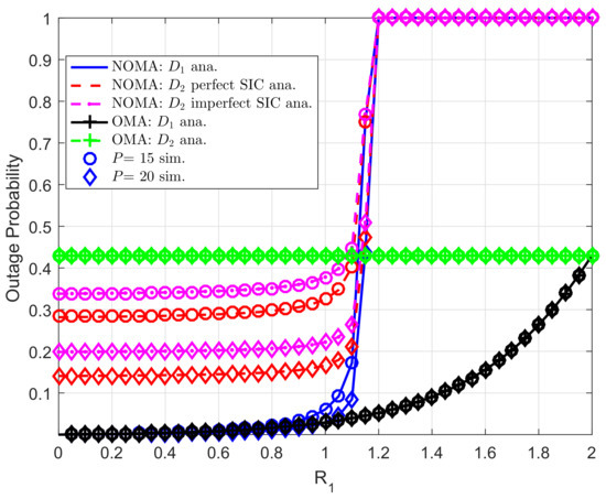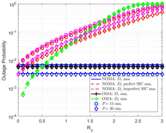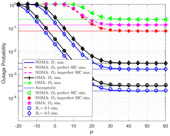 Figure 8 further evaluates outage performance of user as increasing . We set , . As can be seen from the figure, user meets outage event at high target rate , outage performance of user in both NOMA mode and OMA mode does not change in this situation. In this case, higher value of P leads to better outage performance for all users.