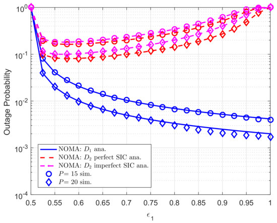 Impact of target rate on outage behavior can be seen in Figure 5 and Figure 6, respectively. In this experiment, we set , . It is confirmed that lower required target rate results in improved outage probability. The main reason is that expression of outage probability depends on achievable SINR and the threshold SINR while such SINR term is decided by the target rate. It is worth noting that outage performance gap among two destinations exist different power allocation factors assigned to such users.