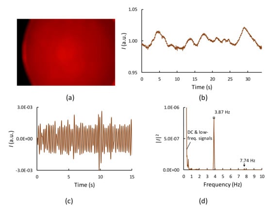 A smartphone camera (Galaxy J7, 1920 × 1080 pixels, Samsung, Seoul, South Korea) with a custom Android application placed on top of the sample holder (Figure 1c) was used to detect the light-intensity variation due to reflection or backscattering caused by the egg tissue. The blood flow increases in the blood vessels during systole, which increases the relative optical pathlength, resulting in low light intensity at the camera. The blood returns to the heart during diastole, causing decreased blood flow through the blood vessels, which leads to reduced relative optical pathlength, resulting in high light intensity at the camera. This pulsatile light-intensity fluctuation, known as the PPG waveform, synchronizes with the changes in blood volume during each heartbeat. A custom Android application transformed the PPG waveform to a frequency spectrum (Figure 1d) and calculated the heart rate.