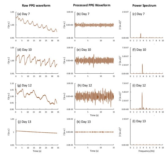 PPG waveforms and their corresponding power spectra of the processed waveforms obtained from a fertile and live egg during incubation on (a–c) day 4, (d–f) day 7, (g–i) day 13, and (j–l) day 19.