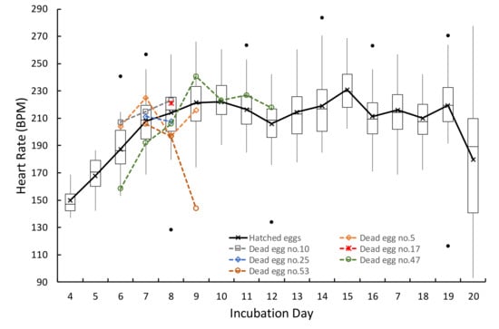 Figure 5 plots the mean HR of the fertile and live eggs as a function of the day of incubation; the daily HRs of 6 dead eggs are shown in the same plot. The results indicate no apparent difference in the HR patterns between live and dead eggs. However, to find a correlation between the health status of chicken embryos and the embryonic HR pattern using appropriate statistical analysis, more data from dead eggs are required.