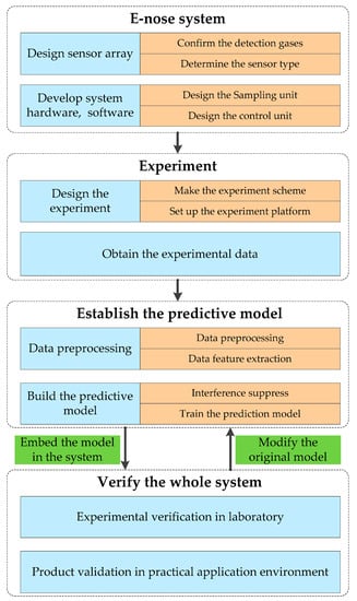 As an artificial nose, electronic nose (e-nose) can analyze the gas characteristics quickly by simulating the biological olfactory system. It consists of a gas sensor array and an appropriate pattern recognition system. The basic structure of an e-nose system is similar to that of the biological olfactory system, in which the gas sensor array, the signal processing unit and the pattern recognition unit respectively simulate the olfactory receptor, the olfactory bulb and the cerebral cortex in the biological olfactory system of the mammal []. Due to its portability and ease of use, e-nose technology is superior to other detection methods, such as chemical detection methods, gas chromatography and mass spectrometer, etc. []. With the development of sensing technology and intelligent algorithms, e-nose technology has been widely used in many areas, such as disease diagnosis by detecting specific biomarkers of diseases or bacteria [,,], air quality monitoring by analyzing the gas pollutions [,,], tea quality assessment [,], food quality detection [,], etc. For a specific application, the design flow of the e-nose system is shown in Figure 1: