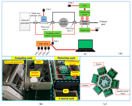 The schematic diagram of e-nose system is introduced in Figure 2a, and the picture of real products is shown in Figure 2b. The e-nose system consists of three parts: a sampling unit, a detection unit and a control unit. The sampling unit consists of 2 three-way valves, a sample chamber, and a mass flow controller (MFC: CS200-C, Beijing Sevenstar Electronics Company Ltd., Beijing, China). The sensor array and its corresponding conditioning circuit constitute the detection unit. The control unit is composed of a PC equipped with a specific software system, which is used to control the sampling system, collect data and analysis the sample. The experimental platform is improved on the basis of the experimental platform in Ref. [], and the following adjustments have been made: (1) The clean air is replaced by zero air produced by the specific generator as carrier gas. Since the useful signal is weak in the animal experiment, the pure carrier gas is needed. (2) The airflow of the experimental platform changes from negative pressure to positive pressure and the air pump is removed. The clean air is used as the carrier gas in Ref. [], and at the end of the system, the pump is added to achieve the gas circulation of the whole platform without affecting the purity of the carrier gas due to the air pump. In this paper, the zero air produced by the specific generator is used as carrier gas. The gas generator has a certain gas pressure when it generates gas, which can make the gas flow, so the pump is not needed. (3) The position of the MFC has changed. In order to control the flow rate of the gas entering the sample chamber, the MFC is placed between the gas generator and the sample chamber in this paper. If the MFC is still placed behind the sensor chamber as in Ref. [], due to the high pressure of the gas generated by the gas generator, the high air tightness of the sample chamber and the sensor chamber is needed.