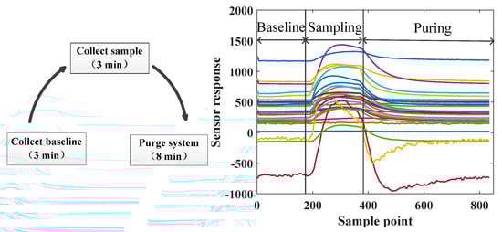In experiments, gas flow of MFC is set up to 100 mL/min. The sampling process of designed e-nose system is divided into three steps: baseline collecting, sample collecting and system purging. The total time of each experiment is 14 min including 3 min for baseline collecting, 3 min for sample collecting and 8 min for system purging. The sampling process and corresponding sensor response cycle are shown in Figure 3. The sampling frequency is set to 1 Hz. For each sample, 840 sampling points are collected. The carrier gas is zero air produced by the specific generator.
