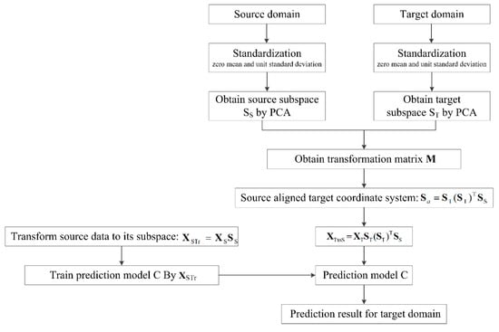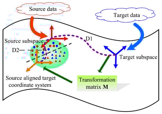 It is crucial to accurately obtain the subspace for each domain in this method. In this paper, principle component analysis (PCA) is used to obtain the subspace. First, every sample of source data and target data is transformed to a d-dimensional z-normalized vector (i.e., zero mean and unit standard deviation). It is an important step in most of the subspace-based domain adaption methods [,]. Then, the source data and target data are analyzed by PCA respectively, and the D eigenvectors corresponding to the D largest eigenvalues are used as the bases of the source and target subspaces. D is the size of subspace. The obtained subspaces satisfy the conditions in Equation (1).