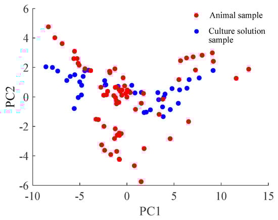 To observe the space distribution difference between two datasets with different sample carrier, the PCA algorithm is applied to Dataset 1 and Dataset 2. The first principal component (PC1) is the horizontal axis and the second principal component (PC2) is the vertical axis. The projected 2-D subspace for the same kind of bacteria with different carrier is shown in Figure 6, from which the significant changes of data space distribution can be observed.