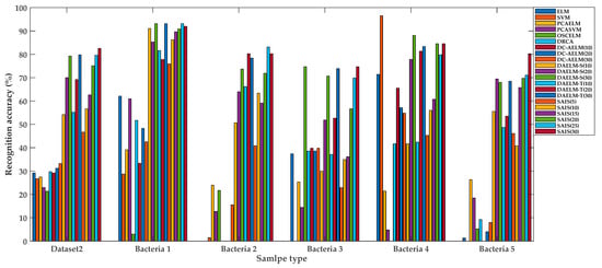 (2) From Table 4 and Figure 7, it can be found that the proposed SAIS method is superior to other methods in discrimination performance. As well, the discrimination performance for each bacterium is very good. However, there is a special case. For bacteria 4, the recognition rate of SVM without suppressing interference is highest. However, the recognition rate of SVM for other bacteria, especially the overall recognition rate of Dataset 2 is very low. Therefore, it is not feasible to directly discriminate using SVM.