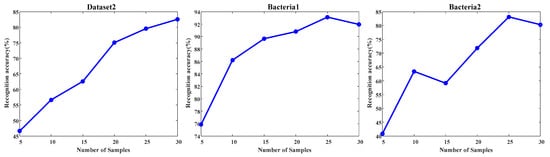 Dataset 1: Dataset 1 shown in Table 2 is a multi-class sample set composed of five kinds of bacteria samples, and the carrier of each bacterium is the culture medium, i.e., the bacterial culture solution is directly used as a sample for experiment. Each sample is the maximum value in the sensor responses sequence. The experimental process is illustrated in Section 2.2.2. The sensor response can reflect the characteristics of each type of bacteria more accurately with the culture solution as the carrier since its background interference is less, thus this dataset can be used to train a robust classification model. The dataset is often divided into training data and testing data. Kennard–Stone sequential (KSS) method [,] is used to select the training samples from Dataset 1. In general, the proportion of training and testing data is approximately 2:1.