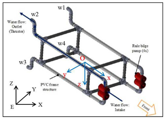 The attitude controller design is based on a full-scale underwater platform depicted in Figure 1, which utilizes a thrust propulsion system powered by four low-cost submersible pumps forming four water-jet thrusters with reducing end nozzles [9]. This provides an optimal thrust to flow rate ratio. By differentiating the power combinations of four motors, the force and moments needed for the propulsion and maneuvering are generated. Figure 1 shows the working mode of AUV, in which the force vector points to the back and two degree of freedoms (DOFs) of the moment to manipulate the pitch and yaw angles. The manufacturing cost is low compared to the deep-water design which would require more control surfaces.