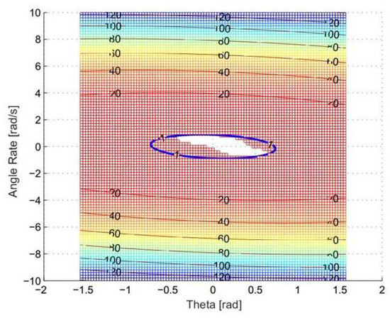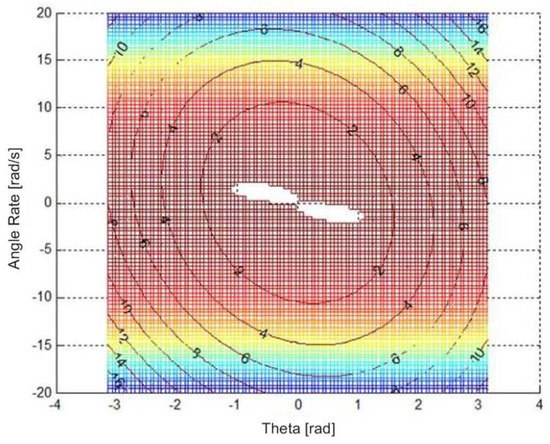 For a given pair of and , with an appropriate choice of P and Q, the Lyapunov function and the derivative of it are specified, which are shown in Figure 2. The blank region in the center indicts where , while the colorful region shows where . The contours represent , where . Figure 2 shows a bunch of Lyapunov contours with different values of . Any contours within the colorful region satisfy Condition ii in Lemma 1.