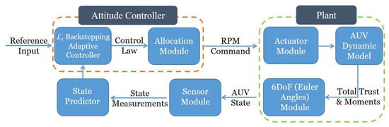 In this paper, based on good study of the nonlinear AUV model presented in [9], which is driven by four water pumps, a precise attitude controller with the combination of backstepping control and adaptive control is proposed for the yaw and pitch channels. The backstepping approach provides a recursive method for stabilizing the origin of a system in strict-feedback form [10]. The kinematics and dynamics of the attitude problem for mobile system with 6-DOF are in strict feedback form, which is a good application of backstepping control strategy [11]. In order to handle large time-varying uncertainties in dynamics, which are from modeling, complicated hydrodynamics, and external disturbances, we bring the adaptive control theory into the backstepping control architecture. The key feature of adaptive control is guaranteed robustness in the presence of fast adaptation [12]. It is a modification of model reference adaptive control (MRAC) and was initially motivated by aerospace applications. With the combination of high gain and low-pass filter, it guarantees fast adaptation and satisfactory transient response. Theoretical results, analysis details and extensions can be found in [12,13,14,15,16,17,18]. Thus, we chose the backstepping adaptive control architecture to achieve robust attitude control of AUVs.