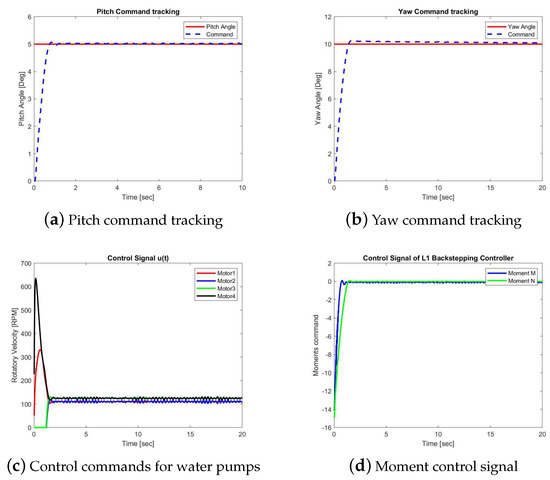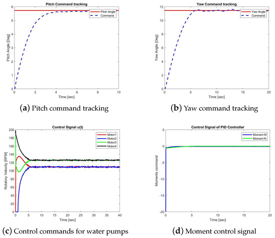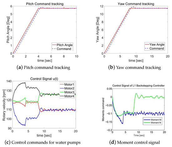 The control laws, and , generated by these two controllers are shown in Figure 6c and Figure 7c, respectively, which are the desired moments with respect to axis y and axis z, namely, moment M and N. The RPM commands sent to the four water pumps are shown in Figure 6c and Figure 7c. Comparing Figure 6a,b, we could see the pitch angle uses less time than yaw angle to achieve the goal. When the desired angle of the pitch channel is reached, the commands are switched to put more effort into the yaw angle channel function.