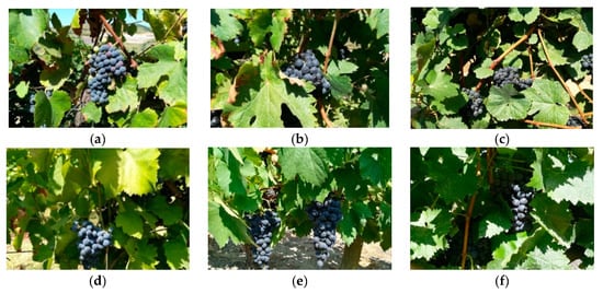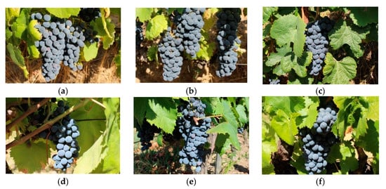A sample of each one of the six red grape varieties of the Douro Red Grape Variety (DRGV) database: (a) Touriga Nacional, (b) Tinta Roriz, (c) Touriga Franca, (d) Tinto Cão, (e) Tinta Barroca, and (f) Tinta Amarela.