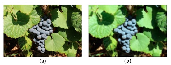 Zernike moments and color information for the description of the grape shapes were also exploited concerning grape detection in outdoor images. For the learning and recognition steps, an SVM was used. In 99% of cases, the recognition of grapes was successful, with very few samples misidentified [14]. From a dataset of 190 images containing bunches of white grapes and 35 images containing red grapes, the visual inspection system using color mapping and morphological dilation techniques, proposed by Reis et al. [1], was able to automatically distinguish between red and white grapes and achieved 97% and 91% of correct classification, respectively.