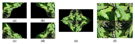 A proposed four-corners-in-one image warping method, described next, was used. From an original raw image (Figure 7a), the LSA, proposed by Pereira et al. [26], was applied. The segmented leaf image is shown in Figure 7b.