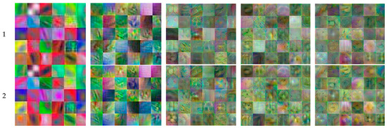 The feature images produced by the first two convolutional layers (Figure 11a,b) contained edges and colors, which indicates that the earlier layers learned about basic features in images. Moving deeper into the last three convolutional layers, it became difficult to interpret the patterns because the deeper layers learned much more abstract information regarding more complex features, which led to generalizations about the classes and not about the own characteristics of the image.
