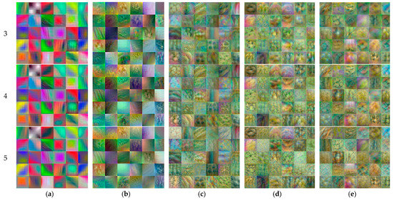 Figure 11 shows the first 30 features learned by the five convolutional layers of the proposed classifier, trained over all the images of pre-processed dataset #9, which was visualized in different image detail levels. The deepDreamImage function with the PyramidLevels parameter enabled us to produce more detailed images. Setting this parameter to 1, the images were not scaled.