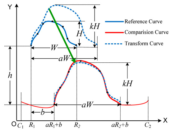 which is called the curve similarity distance of FB to FA under the transformation T. The meanings of a, b, k, h are the same as those described in Formula (1) and Figure 2, corresponding to the translation and scale transformation of the horizontal and translation directions, respectively. Meanwhile, t is the starting point position of the optimal matching of the reference curve on the comparison curve.