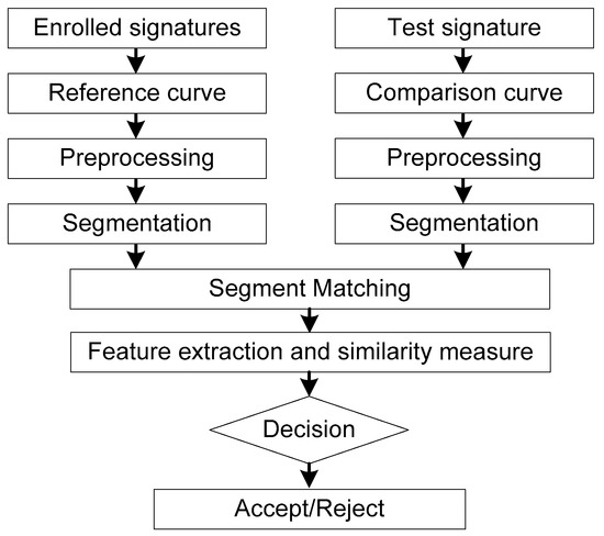 Bonus template matching approaches are considered, and a longest common subsequences (LCSS) combined elastic distance metrics is also used [22]. A discrete cosine transform (DCT) [23] has been applied to 44 time signals. A multi-section vector quantization (VQ) approach [24] has been suggested where all signatures are represented by vectors of the same length. Similar methods such as the Fourier description [25], wavelet packet and discrete wavelet transform (DWT) [26] have been presented too.