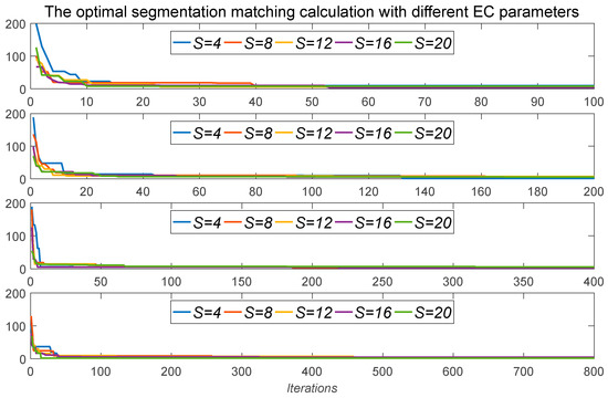 The optimal segmentation matching calculation between the template signature and itself was executed. The theoretically similarity distance of each segmentation is theoretically zero. The parameters S and Iterations of the EC are determined by enumeration calculation as seen in Figure 9, where S = 4, 8, 12, 16, 20 and Iterations = 100, 200, 400, 800. In the abovementioned optimal segmentation matching calculation, although the global optimal parameters are not obtained, the different S and Iterations can quickly reach the local minimum. Comprehensive calculation of speed and accuracy requirements, choose S = 20 and Iterations = 400 as the control parameters for EC.