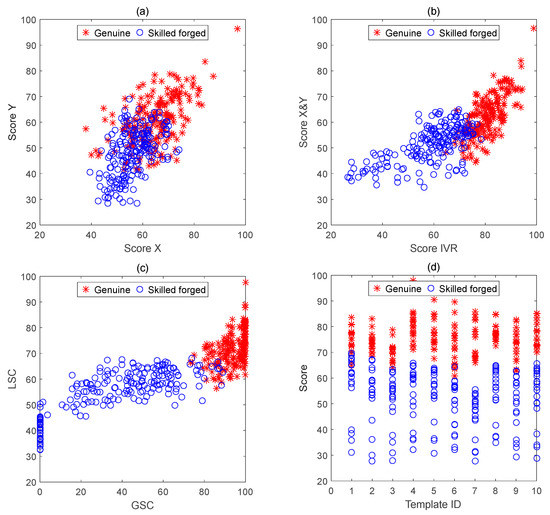 One of the first 10 genuine signatures is used as the template signature in turn, and the remaining genuine and skilled forged signatures are used as the comparison result of the test signatures. (a) Score X and score Y distribution; (b) Score IVR distribution; (c) GSC and LSC distribution; (d) 10 templates in turn Score distribution.