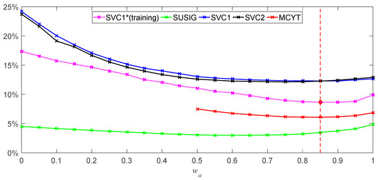 From Table 4, it can be seen on the training samples that the minimum EER is obtained when wa = 0.85, and the EERs on the other datasets are 3.47%, 12.30%, 12.25%, and 6.07%, respectively. At this point, the same minimums are obtained on SVC1 and MCYT datasets. In Figure 11, we can see that when wa is incremented, the EER value changes to a convex function, and the EER on different datasets has only a minimum value.