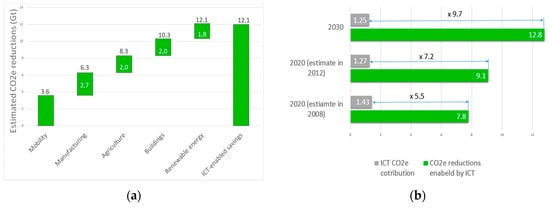 Estimated: (a) contribution of different industry sectors to global carbon-dioxide equivalent (CO2e) reduction by 2030 [1], (b) information and communications technology (ICT) sector CO2e “footprint” contribution and enabled reductions to global CO2e emissions expressed in Gt [2].