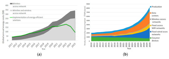 Estimation of (a) costs for the global annual energy consumption of telecommunication networks in period 2011–2025 [2], (b) expected total annual energy consumption per different ICT systems in period 2010–2030 [10].