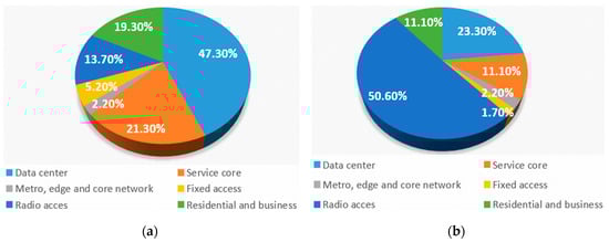 Estimated network energy consumption for main communication sectors in: (a) 2013 and (b) 2025 [3].
