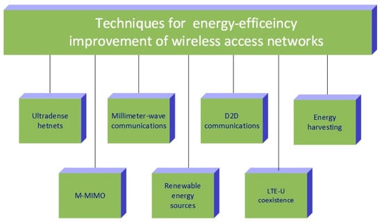 where SS, BW (Hz), FR, D (m), PC (W) and PT (W) represents the number of spatial streams (spatial multiplexing factor), the bandwidth of signal, frequency reuse factor, distance among communicating devices, circuit (mostly static) and transmit (mostly dynamic) power consumption of communicating devices, respectively. According to EE Equation (1), the EE of cellular networks can be increased by augmenting the signal bandwidth, the multiplexing factor, the frequency reuse factor, or by lowering the circuit and transmit power consumption. In this regard, different paradigms for 5G networks have emerged (Figure 5): Communications based on millimetre-waves (mmWave), long term evolution in unlicensed spectrum (LTE-U), ultra-dense heterogeneous networks (UDNs HetNets), device-to-device (D2D) communications and massive multiple-input multiple-output (M-MIMO) communications. The impact of each technology on EE of radio access networks is further discussed. In Table 1, an overview of technologies for EE improvements of wireless networks with future research challenges characteristic for each technology is summarised.