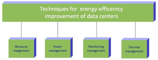 where PIT is instantaneous power of the IT equipment consumed by the DCs storage, network, servers and monitoring devices (laptops or workstations), and PTOT is the overall DC instantaneous power consumption which includes the aforementioned PIT power and instantaneous power consumption of ancillary DC equipment (cooling system, power distribution system, uninterruptable power supply, etc.). In [39], an average value of the present DCs PUE is suggested to be 1.83 and according to the Equation (2), better DC EE means lower PUE and vice versa. Since PUE of present DCs is extremely high, different techniques and approaches for improving EE of DC arise. TheEquation (2) indicates that a better PUE can be accomplished if total DC facility power will be reduced and to this end, research efforts focused on improvement of DC energy-efficiency encompass the following techniques: improvement of DC resource management, increasing DC servers efficiency through power management, developing green DC monitoring and simulations and enhanced thermal management of DC. In Table 2, each of the stated techniques for improvement of DC energy-efficiency with corresponding future research challenges is presented. Also, Figure 6 summarises techniques for energy-efficiency improvement of DCs and an overview of the latest research on green DCs is presented in the next sections.