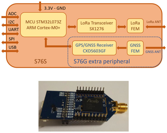 The design is centered on the S76G chip (Acsip Technology Corp., Taoyuan City, Taiwan). It integrates a STM32L0 ultralow-power MCU with an Arm® Cortex®-M0+ core, a LoRa SX1276 Transceiver, and a Sony GNSS Receiver CXD5603GF for high precision position measurement. Figure 1 shows details of S76G.