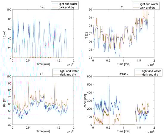 The considered quantities are illuminance, temperature, relative humidity, and total VOCs (TVOCs). The sensors have been assembled on the same board equipped with wireless data transmission.