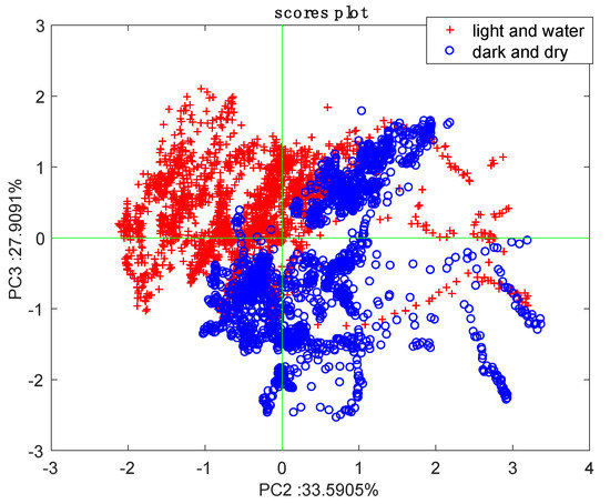 Since the illumination is drastically different, it was eliminated from the calculus of PCA. The first principal component carries most of the quantitative information; thus, the separation between the two plants is rather obvious and it can be directly observed in Figure 3. More interesting is to observe the behavior of the other two principal components where the influence of the magnitude of signals is reduced. The results of PCA are manifested by the scores and loadings plots. Figure 4 shows the scores plot with a clear separation between the two conditions. It is worth considering that the measures are dynamically evolving, and each parameter spans an overlap range of values throughout the day. Thus, the fact that most of the time, the two conditions are clearly separated is a not trivial result.