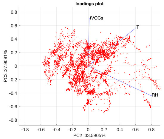 The three variables are divergent from each other, which shows that each variable contributes independently to the scores plot. This is particular evident for relative humidity and total VOCs. The separation between the two conditions is minimally influenced by the temperature, but it is rather dependent on total VOCs and humidity.