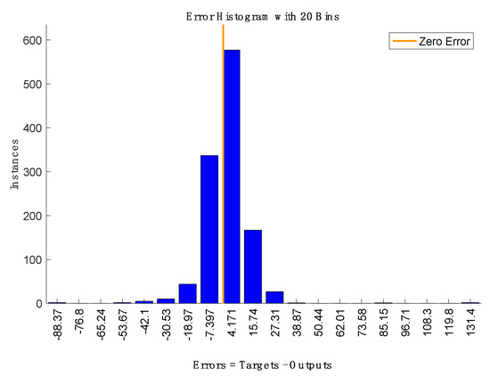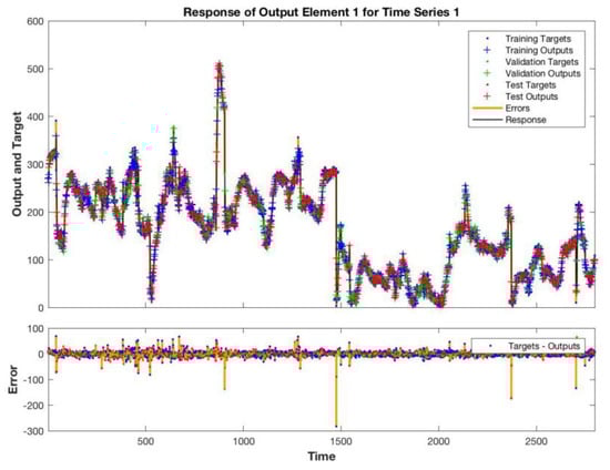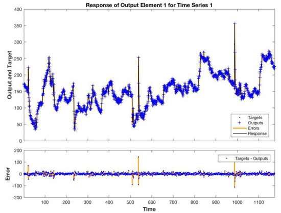 Figure 6 shows the sequence of estimated and measured total VOCs in the training data set. Large errors are achieved at the transitions between sequences of data. In correspondence of these points, the temporal relationship between data is obviously lost. Figure 7 shows the network estimate of the test data set, which corresponds to the last sequence of data of both plants. In Figure 8, the histogram of the errors is shown. Most of the errors are in the interval between −7 and + 15 ppb, only 3% of the whole range of variability of the total VOCs.