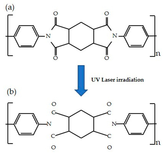 Principle of laser-induced graphene (LIG). (a) Structure of polyimide film; (b) Structural change of polyimide film after laser irradiation.