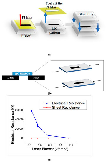 Recently, metal wires, carbon nanotubes, and graphene have been applied to substrates such as polyethyleneimine (PEI), polyethylene terephthalate (PET), ECOFLEX, and polydimethylsiloxane (PDMS); the resulting materials are mechanically flexible and robust, and are used in many areas such as touch screens, biomedical devices, wearable devices, human–robot interfaces, solar cells, and supercapacitors [1,2,3,4,5,6,7,8,9,10,11,12,13,14,15]. In particular, graphene is widely used in sensors due to its high electrical conductivity and various superior mechanical characteristics [7,11,16,17,18,19,20]. Graphene production methods include (1) exfoliation from graphite crystals and (2) chemical vapor deposition (CVD) involving deposition of carbon on a transition metal at high temperature [21,22]. Recently, research on the production of porous graphene using lasers, i.e., laser-induced graphene (LIG), has been reported [21,22]. Irradiation of a laser onto polyimide film at a certain degree of laser fluence, i.e., the optical energy delivered per unit area, resulted in photothermal ablation by the locally high temperature, which breaks the chemical bonds of the polyimide film; this process has been reported to produce LIG with a porous multilayer structure [11,20,21,22]. The LIG has improved electrical properties due to the conversion of sp3 carbon atoms to sp2 carbon atoms. [11]. Therefore, LIG is widely applied to humidity-, bio-, and mechanical sensors [11,18,19,22]. Mechanical sensors include strain sensors and pressure sensors; PDMS, which is actively used as substrate for these sensors, is thermally and chemically stable, physically robust, and flexible, with a shear modulus of 250 kPa, loss tangent <<0.001, and Young’s modulus of 750 kPa [14,15]. In addition, PDMS is transparent, nonfluorescent, nontoxic, and biocompatible; it undergoes no adhesion with polymer films, and so is suitable for use in MEMS and biomedical applications [14,15].