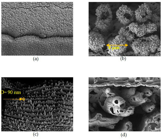 Laser fluence-dependent SEM images of LIG pattern; laser fluence of (a) 5.6 J/cm2; (b) 5.9 J/cm2; (c) 6.4 J/cm2; (d) 7.4 J/cm2.
