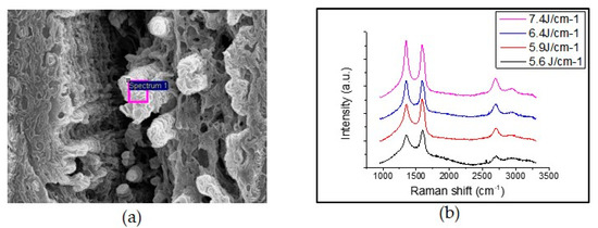 The graphene-like flake structure of the LIG pattern; (a) SEM image of the graphene-like flake structure of LIG; (b) Raman spectra of the LIG pattern irradiated laser with different laser fluences.