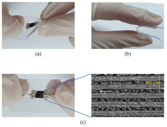 A porous and graphene-like flake-structured LIG pattern was implanted on a flexible PDMS substrate and then protected again with PDMS to produce a bendable and highly sensitive strain sensor (Figure 6).