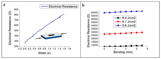 In order to evaluate the sensing properties of the strain sensors, we studied the strain-induced changes in electrical resistance of the LIG patterns. As shown in Figure 7a, when the strain sensor is fabricated by irradiation with a 355 nm pulsed laser with a laser fluence of 7.4 J/cm2, the electrical resistance to strain changes from 234 to 837 Ω, which means that the porous LIG pattern shows high sensitivity (GF ~ 160) even for fine strain (1.6%). When the bending distance changed, the corresponding variation in the electrical resistance increased linearly and the GF values of the laser fluence at 6.4, 6.1, and 5.6 J/cm2 were 8.5, 4.18, and 2.03, respectively (Figure 7b).